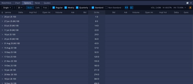 تاريخ انتهاء الصلاحية: عادةً ما يكون مدرجاً في الأعلى، أو يمكنك الاختيار من قائمة منسدلة. سترى أوبشن أسبوعية، شهرية، وأحياناً حتى LEAPS (الأوراق المالية ذات التوقعات الطويلة الأجل)
