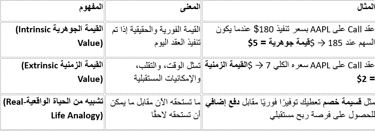 مثال 1: إذا كان سهم أبل عند 185 دولارًا ولديك أوبشن شراء بسعر تنفيذ 180 دولارًا، فإن قيمته الجوهرية هي 185 دولارًا - 180 دولارًا = 5.00 دولارات