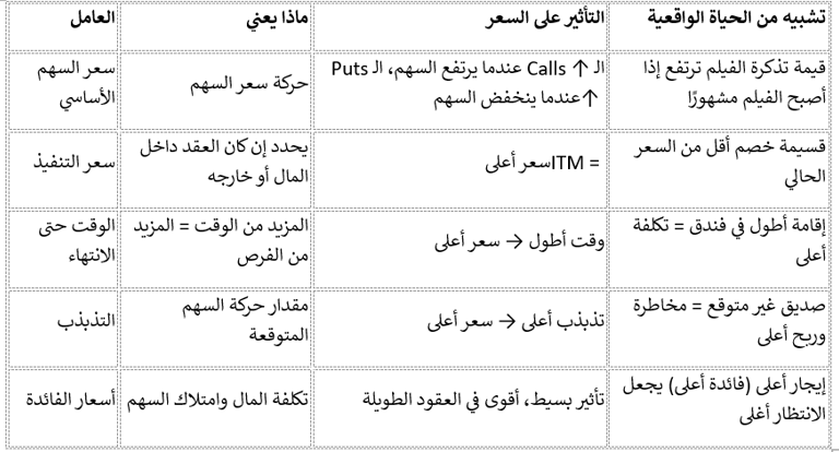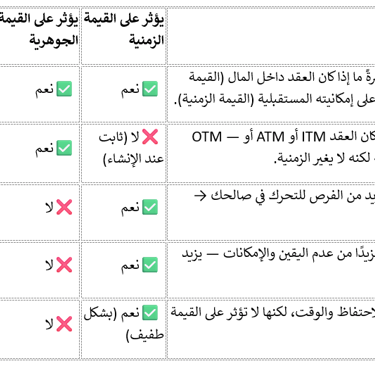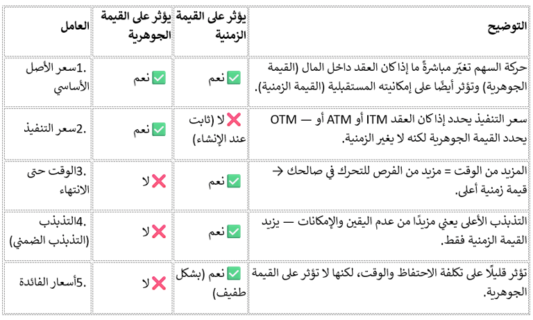 ⚙️ العوامل الخمسة وكيف تؤثر على قيمة الأوبشن (Premium)