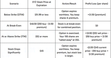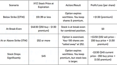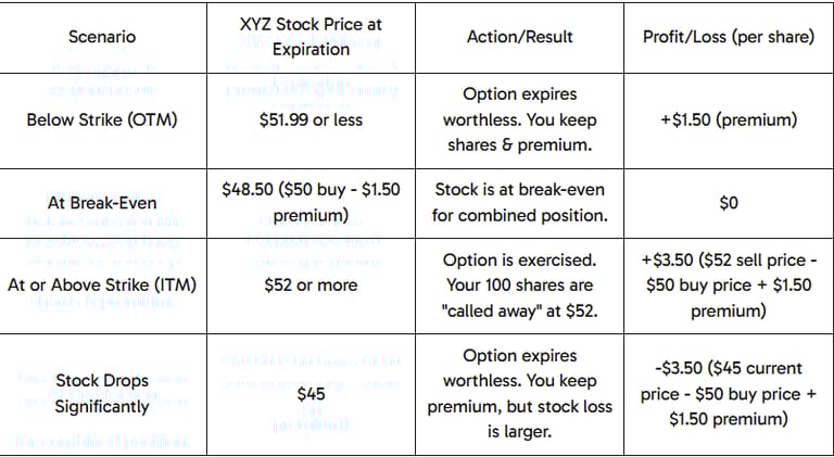 You sell 1 XYZ $52 Call option expiring in 1 month for a premium of $1.50 per share (total collected: $1.50 x 100 shares = $150).