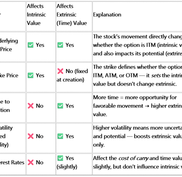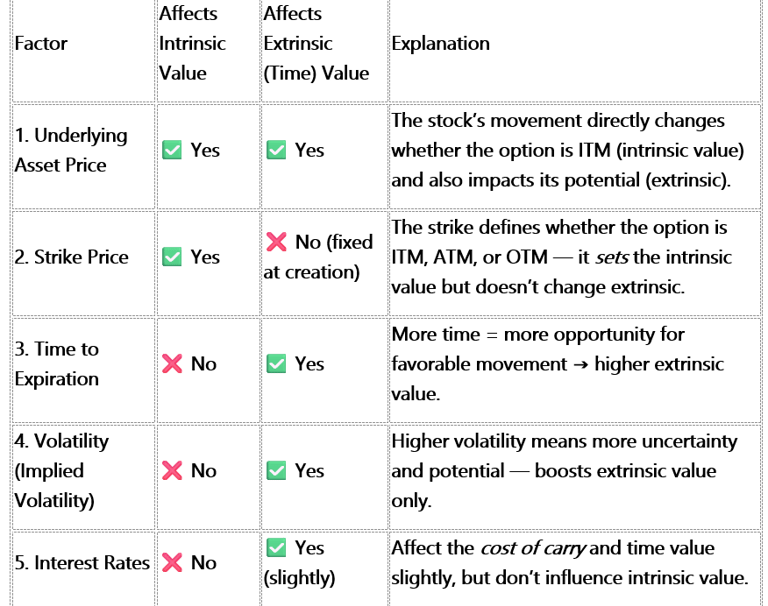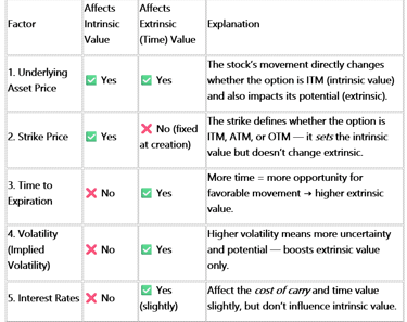 While intrinsic and extrinsic value are the components, several external factors cause these values to change. These are the main drivers of an option's premium: