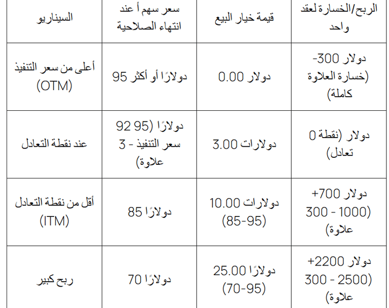 تشتري 1 عقد خيار بيع أ بسعر تنفيذ 95 دولارًا ينتهي بعد 3 أشهر بعلاوة قدرها 3.00 دولارات للسهم الواحد (التكلفة الإجمالية: 3.00 دولارات × 100 سهم = 300 دولار).